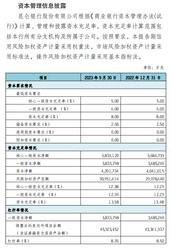 昆侖銀行股份有限公司2023年3季度信息披露 |